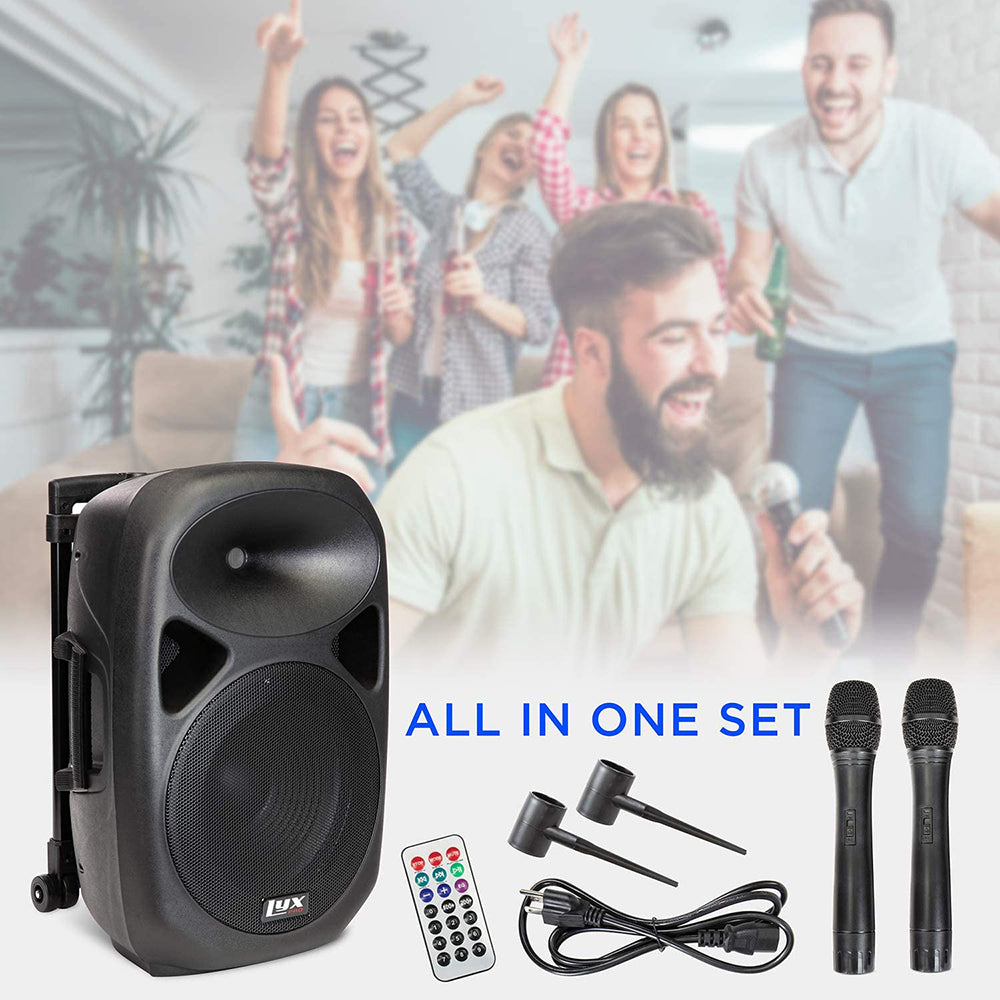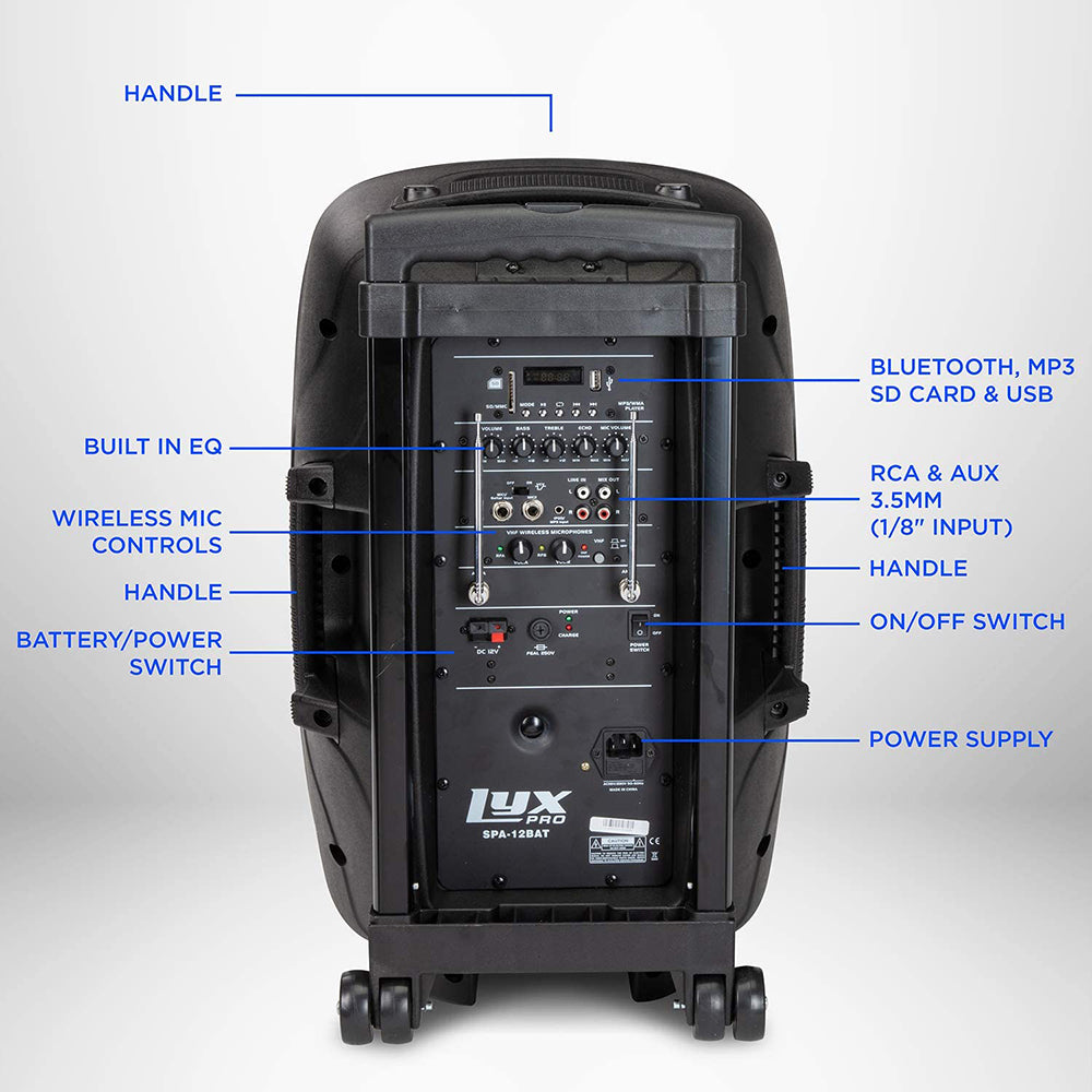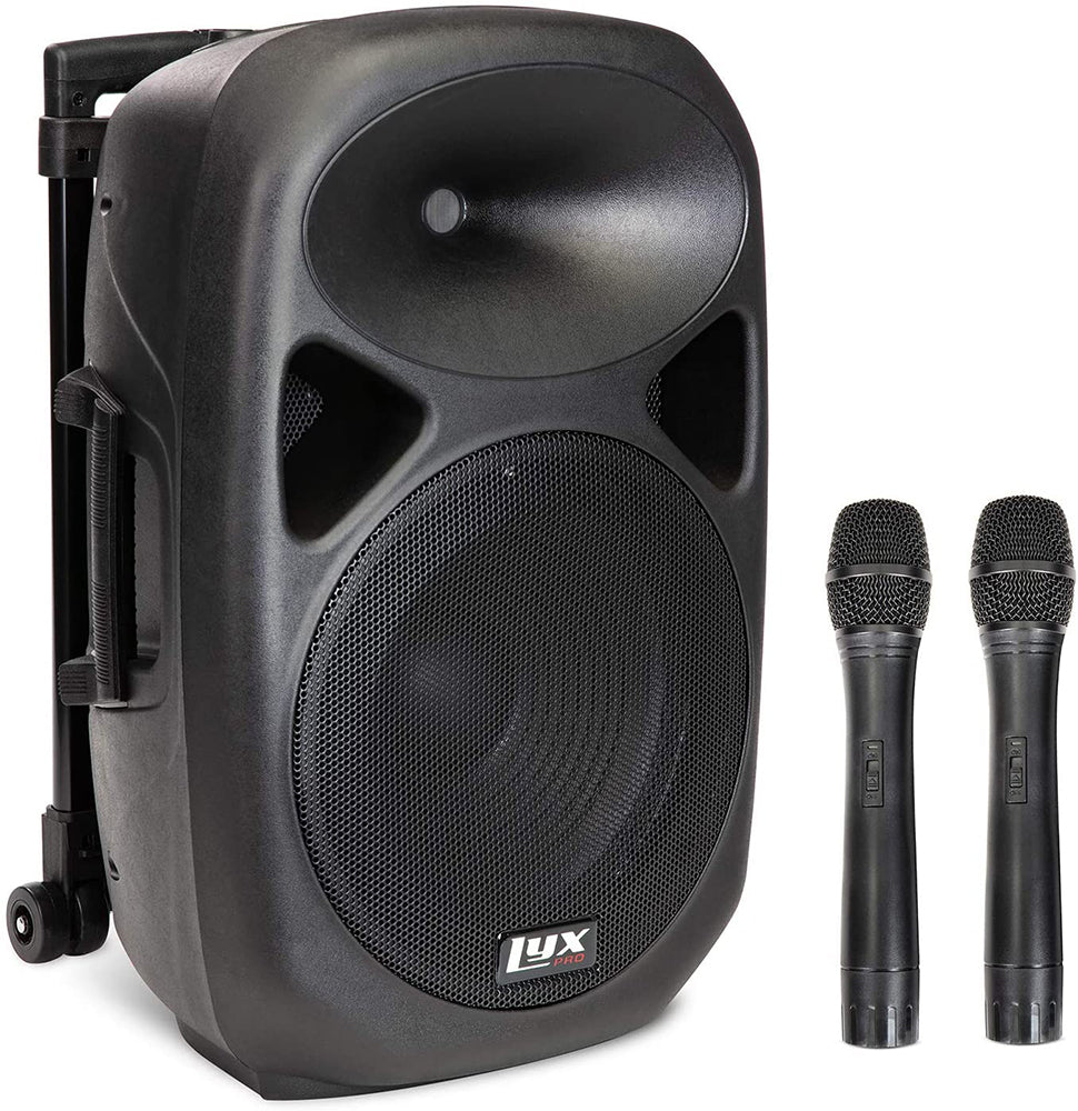 The battery powered PA system comes with a pair of wireless hand-hand VHF microphones for performing or speaking. In addition, the Voice Control Volume function emphasizes the mics over the music for important announcements and introductions. Best of all, the speaker is super portable thanks to the built-in handle and easy-rolling wheels, making transport, storage, and setup a total breeze!