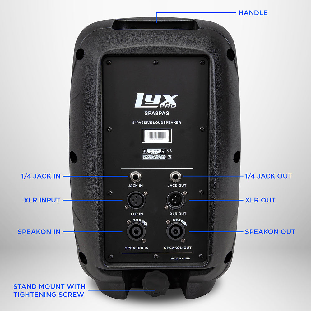 Highlighted by 100 Watts of power, our Passive Speaker comes with an 8”, 20 oz. 1” VC DJ/PA woofer system for quality output in any setting. Just connect a musical instrument or playback device to the back, or pair the speaker with others for a daisy chain of impressive audio.